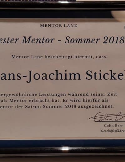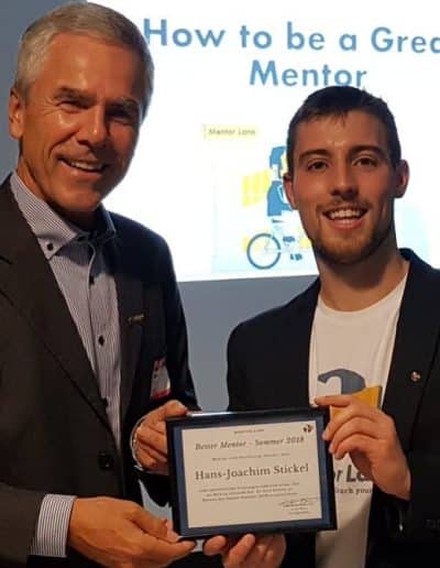 Ein weiterer Höhepunkt des Abends war die Vergabe der Mentor Lane – Auszeichnung an Hans-Joachim Stickel und Corinna Haas als beste Mentoren des letzten Vierteljahres.